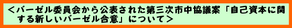 (1)  現行合意に比べて信用リスクの計算方法を大幅に改定すること、特に、(1)中小企業向け・個人向け貸し出しについては、小口分散によるリスク軽減効果を考慮して、リスクウェイトを軽減、(2)引当率の低い不良債権は加重、引当率の高い不良債権は軽減するといった点が第三次市中協議案において提案されています。