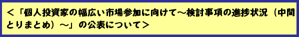 | ※ | 「個人投資家の幅広い市場参加に向けて」(〜検討事項の進捗状況(中間とりまとめ)〜)等をご覧になりたい方は、日本証券業協会ホームページの「投資者の皆様へ」から、「個人投資家育成対策会議」にアクセスしてみてください。 | ||||||||||||||||||||||||||||||||||||||||||||||||||||||||||||||||||||||||||