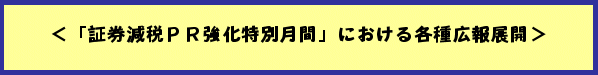 | 去る5月14日、「証券市場活性化関係閣僚等による会合」が開催され、「証券市場の構造改革と活性化に関する対応について」が公表されました。この中で、政府において「早急に対応」すべきこととして、「証券関係各団体等に対して、個人株主育成の観点から、アクション・プランを策定すること等を要請する」こととされました。これを受け、同日、金融庁より、「個人株主の育成・拡大に向けたアクション・プラン策定の要請」を公表するとともに、証券取引所、日本証券業協会等の関係各団体に対し、個人株主の育成・拡大に向けて、早急に総合的なアクション・プランを策定するよう要請いたしました。 その要請の中で、「個人投資家の立場に立ったPRの推進」のため、関係各団体で立ち上げる「証券市場活性化戦略会議(仮称)の下に、『証券減税PR特別チーム』(仮称)を編成し、政府における『証券減税PR強化特別月間』(仮称)の活動と連係しつつ、民間による効果的なPRを検討、実施する。(注)政府においては、証券減税PRの取り組みとして、『証券減税PR強化特別月間』(仮称)を設定し、集中的に政府広報等を行う」ことといたしました。そして、政府においては、本年7月をこの「PR強化特別月間」とし、民間におけるPR活動とも連係しながら、政府広報等の各種媒体を通じて、平成15年度証券税制改正の内容や今国会(第156回国会)における証券取引法等一部改正の内容など、証券投資がより身近に、より有利になったことをわかりやすく解説するなど、「貯蓄から投資へ」の流れを加速させるため、証券投資全般について集中的かつ強力に広報展開しているところです。 以下、「PR強化特別月間」中における政府広報等における広報活動をご紹介いたします。アクセスFSAから政府広報オンライン等にリンクいたしましたので、どうぞアクセスしてみてください。また、以下ご紹介するものの中には、まだ新聞・雑誌等に掲載されていなかったり、テレビでオンエアされていなかったりするものもありますが、これから続々と登場いたしますので、どうぞご注目ください。 | |
