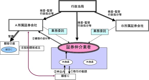 具体的には、証券会社等の委託を受けて有価証券の売買の媒介等の証券仲介行為を当該証券会社等のために行う営業を証券仲介業と定義し(同法2条11項)、その主体である証券仲介業者については、内閣総理大臣の登録に当たって、登録申請者(登録申請者が法人である場合はその役員を含む。)に過去に行政処分歴・犯罪歴がないか、証券仲介業を適切に遂行することができる知識及び経験を有しているか等を確認するほか(同法66条の5)、証券仲介業者の役員・使用人のうち勧誘行為を行う者については、外務員登録を受けなければならないこととします(同法66条の23において準用される64条)など、一定の資質を求めることとしました。
