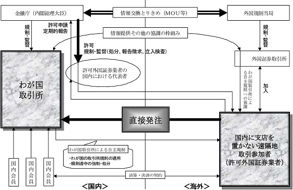 さらに、当局や我が国証券取引所の自主規制による監督・監視の実効性を確保する観点から、当該外国証券業者について、国内に代表者を置くことを義務付け、また、許可に当たっては、(1)当該外国証券業者を監督・監視する外国規制当局から必要な情報の提供が受けられる体制が整備されていること、(2)当該外国証券業者が加入している海外の証券取引所が情報提供等を通じて我が国証券取引所による自主規制をサポートする仕組みが整備されていることなどを要件として求める、という枠組みを構築することとしました(外国証券業者に関する法律13条の2〜13条の5、24条4項、31条3項等)。