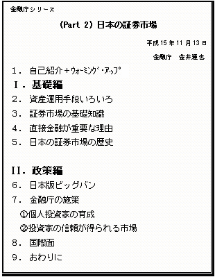 | 2 | .2ヶ月前「学生さん達全員にどうやって理解し満足してもらうか?」 ここからは、筆者自身の経験を、楽屋裏風にお話しようと思います。吉野センター長の「金融資産市場論」ということで、元気よくお引き受けしたのが、講義の2ヶ月前。まず、同期の後藤君が「銀行の不良債権問題」、筆者が「日本の証券市場」と分担を決めました。 そしてこの時考え始めたこと、それは、「証券市場についての基礎知識が多様な学生さん達全員にどうやって理解し満足してもらうか」、ということでした。経済学部生800人を前に話をさせていただけるということは、創立まだ2年半の金融研究研修センターにとってはまたとない機会であり、全ての学生さんに満足してもらいたいと思いますが、証券市場の話というのは、なかなか馴染みない上、深みに入ると直ちにおタクの世界に入りこむという逆の面もあります。さらに経済学部の3、4年生800人となると証券市場についてどのくらい知っているのか、考えても考えてもイメージが湧きません。結局、資料としては、「I. 基礎編」と「II. 政策編」の二つを用意して、当日学生さん達に聞いてみることにしました。できあがったレジュメの1ページ目で、段落構成をご覧ください。(資料1) | ||||||||||||||||