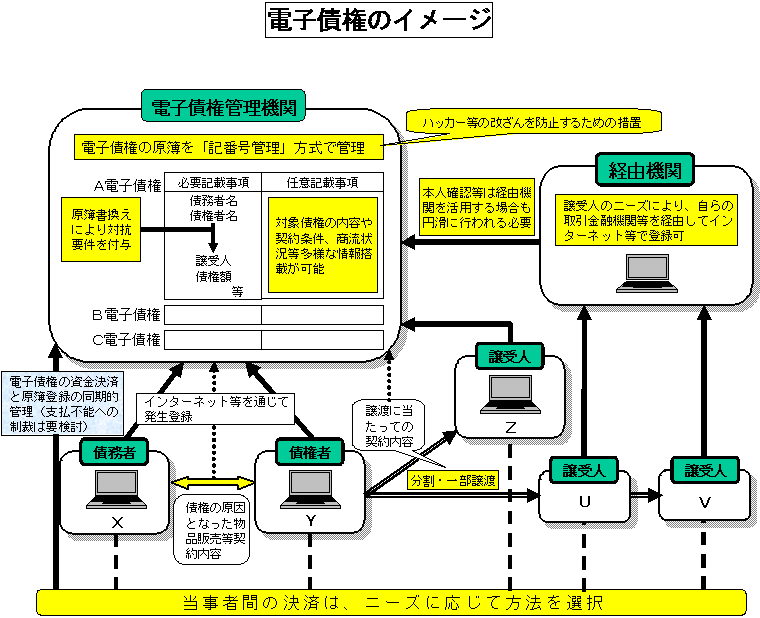 | 1 | .「議論の整理」の概要 「議論の整理」において、電子債権は、「指名債権とも手形債権とも異なる新しい債権であり、売買等の原因契約とは別個に電子的手段により発生、譲渡されるもの」として位置づけられています。また、現行の指名債権の譲渡や手形制度に関して指摘されている課題を一体的に解決するだけでなく、様々な商流情報等の金融サービスにおける活用を可能にする等、将来の情報技術革新の成果を享受できる新たな金融インフラとして、我が国の金融システムにおける金融仲介機能及び決済機能を一層発展させ得るものであるとされ、具体的には下記のような効果が期待されています。 |