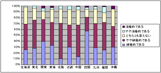 地域毎にばらつきは見られるものの、全地域において「積極的である」、「やや積極的である」との意見が概ね6~8割を占めています。また、「消極的である」、「やや消極的である」との意見は全地域において概ね1割を下回っています。