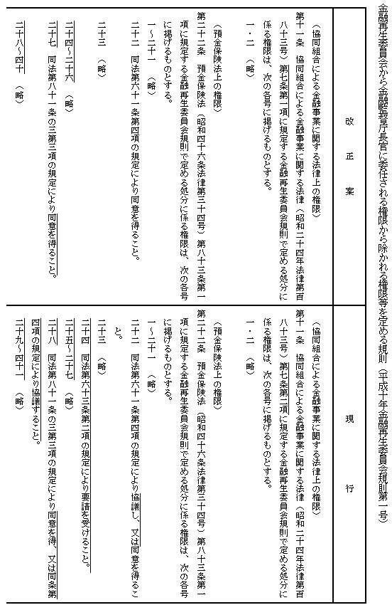 | (1) | 協同組合による金融事業に関する法律上の権限関係 協金法の改正による権限委任(金融再生委員会→金融監督庁長官)規定の項番号の変更(協金法第第7条第2項→第7条第1項)に伴う改正(第11条関係)