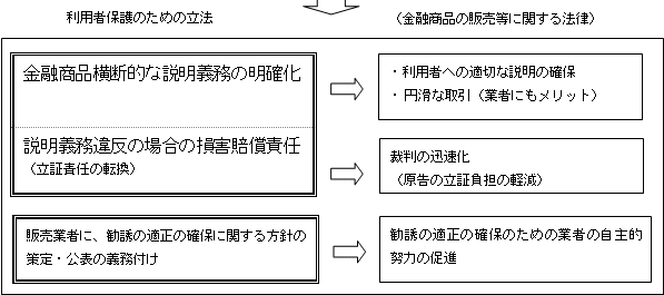 金融商品は、その危険性が顧客にとって一見して分からないため、説明が不十分であったことを理由とした紛争が少なくありません。しかし、銀行法、保険業法、証券取引法等の各種の業法に規定されているさまざまな情報提供義務に関する規定に違反したとしても、直ちに損害賠償責任が生ずるわけではなく、業者の説明不足が不法行為と認定され損害賠償が認められるには、裁判において個々のケースごとに説明義務の存否を争う必要があり、これに伴う裁判の長期化が原告顧客側に大きな負担となっています。このため、予見性の高いルールとして、損害賠償が認められる前提となる説明義務を類型化して明示すべきとの強い要請があります。