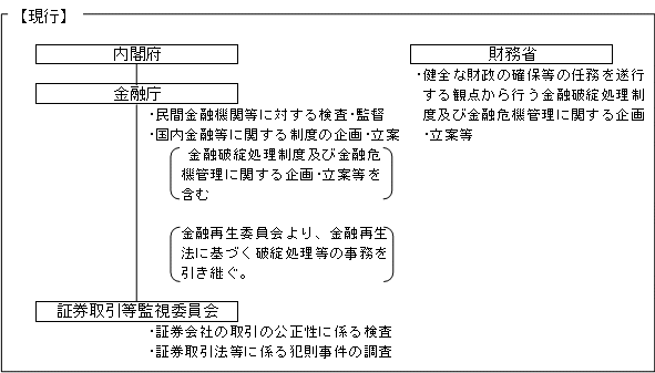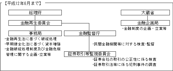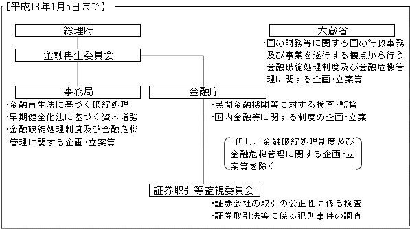 | 金融庁は、昨年7月1日に、全体の中央省庁再編に先行して、金融再生委員会に置かれていた金融監督庁と大蔵省金融企画局を統合して設立されましたが、本年1月6日の中央省庁再編に当たって、改めて内閣府の外局として設置されるとともに、金融再生委員会の廃止に伴い、同委員会が担っていた破綻処理等の事務を承継することとなりました。これにより、金融庁は、金融制度の企画立案から検査、監督、監視の実施機能までを一貫して担うとともに、銀行、保険及び証券等の分野を横断的に所管し、金融行政を一元的に遂行することになりました。 また、今般の中央省庁再編に伴い、機構面では、内閣機能強化の観点から内閣府に新設された特命担当大臣が金融庁の所管事項について設置されるとともに、金融行政の重要性に鑑み、これまでの総務企画部、検査部及び監督部の3部体制が、総務企画局、検査局及び監督局の3局体制に強化されることになりました。 なお、金融再生委員会が担ってきた破綻処理や資本増強に係る事務に関しては、監督局総務課に金融危機対応室及び監督企画官を新設し、業務執行体制を整備しました。 さらに、資本増強・破綻処理に係る基本的問題及び個別案件のうち特に重要なものに関しては、従来金融再生委員として多大な貢献をされてきた方々の御意見を伺い、その意見を金融行政に適切に反映させるため金融庁顧問会議を設置しています。 | |||||||||