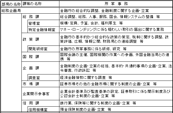 | 1 | .機構・定員 機構面では、金融行政の専門性・先見性向上のため「研究開発室」等を新設することとし、定員面では、時限定員21人の恒久化を含め110人の増員を図り体制を整備することとしています。各部局別の体制整備の概要は以下のとおりです。 | ||||||||||||||||||||||||||||||||||||||||||||||||||||||||||||||||||||