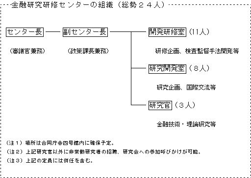 | 金融庁では、平成13年度に研究研修体制の充実・強化のため「研究開発室」及び「研究官」の新設、「開発研修室」の機能強化が認められたことを踏まえ、「研究と研修を効果的に連携させる」仕組みとして、平成13年7月を目途に「金融研究研修センター」を発足させ、研究研修業務の統合運営を開始。 |