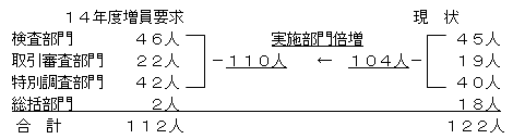 | 3 | .予算要求の内容 平成14年度予算要求では、既定予算の徹底した見直しを行い、上記の増員に伴う経費や、機動的な検査・監視の実施、海外当局との連携強化等を図るための経費を折り込み、総額131億円を要求することとしている(別紙1)。また、「構造改革特別要求」において、有価証券報告書等の電子開示システム(EDINET)の整備に必要な経費(473百万円)、証券総合システムの整備に必要な経費(393百万円)の総額9億円の要求を内閣官房へ提出することとしている(別紙2)。 なお、預金保険機構に係る公的資金枠については、現行の70兆円の枠組みを維持することとし、53.4兆円の政府保証枠を要求することとしている。 | ||||||||||||||||||||||||||||||||||||||||||||||||||||||||||||||||||||||||||||||||||||||||||||||||||||||||||||