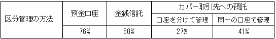 顧客が預託した保証金と業者自身の財産とは、預金口座、金銭信託又はカバー取引(注1)先への預託等のいずれかの方法で区分管理することとされています。
