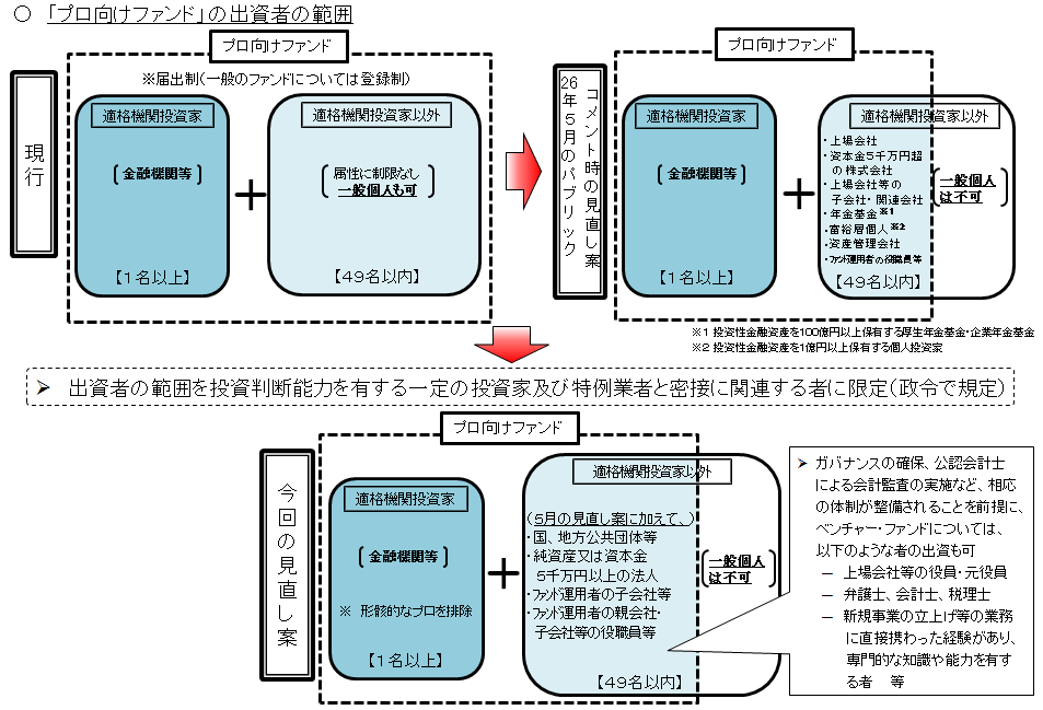 - ○また、今回の法改正を受け、関連する政令・内閣府令案及び監督指針案(※1)を平成27年11月20日(金)から公表し、広く意見(パブリック・コメント)の募集を行っています(募集締切日は平成27年12月21日(月))(※2)。 - ※1 政令・内閣府令案及び監督指針案の内容は、平成27年1月28日付「金融審議会 投資運用等に関するワーキング・グループ 報告 ~投資家の保護及び成長資金の円滑な供給を確保するためのプロ向けファンドをめぐる制度のあり方~」(「ワーキング・グループ報告書」)を踏まえています。 - (参考)ワーキング・グループ報告書