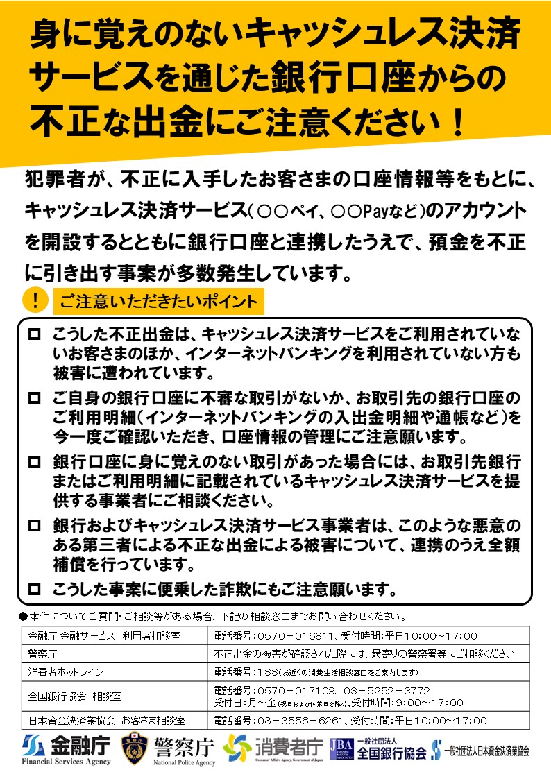 身に覚えのないキャッシュレス決済サービスを通じた銀行口座からの不正な出金にご注意ください!