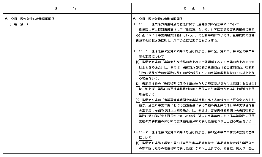 .産業活力再生特別措置法に関する留意事項について、金融監督庁において、本日、事務ガイドライン(「金融監督等にあたっての留意事項について(第一分冊:預金取扱い金融機関関係)」)を改正し、各財務局に通知した。