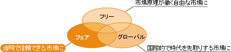●わが国の金融市場を再生させるために、政府は1フリー(市場原理が働く自由な市場に)、2フェア(透明で信頼できる市場に)、3グローバル(国際的で市場を先取りした市場に)の3原則を柱とした金融システム改革(いわゆる日本版ビッグバン)を進めています。