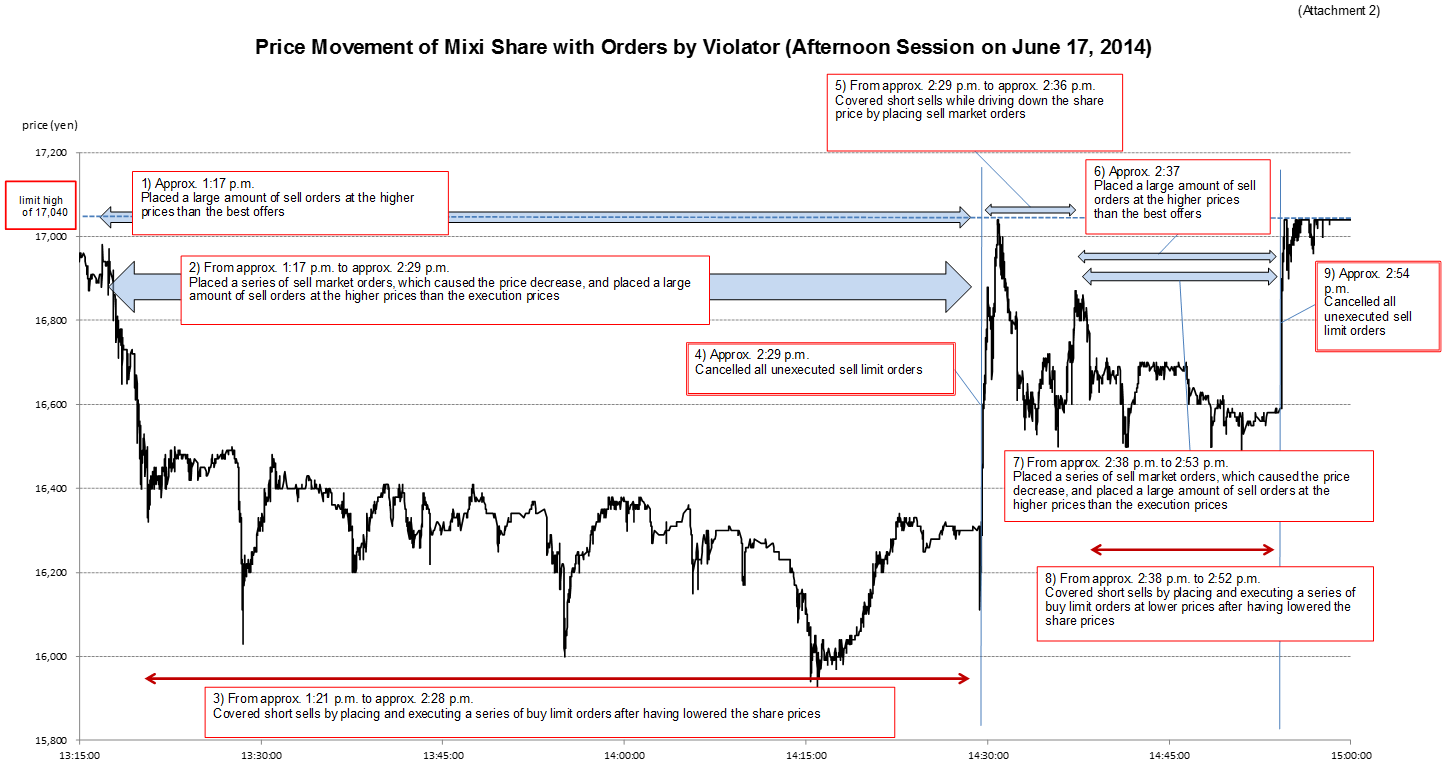 Blue Sky is a proprietary company whose principal place of business is located in New South Wales, Australia. Pursuant to the investment management agreements entered into with relevant parties such as the general partner, Blue Sky has the authority to manage the assets invested in three funds: Blue Sky World L.P. and Blue Sky Japan L.P., both of which were formed in the Cayman Islands as a limited partnership, and MAH Capital Pty Limited, which was incorporated in Australia as a corporation. Blue Sky, through a person who engaged in securities trading, in relation to its business, as described in the Appendix, regarding shares of mixi, Inc., whose shares are listed on the Tokyo Stock Exchange Mothers Market, from 1:17:03 p.m. to 2:54:16 p.m. on June 17, 2014, with the purpose of inducing sales and purchases of other market participants, conducted transactions including the following: (i) decreasing prices by placing a series of large amounts of market sell orders and (ii) without intention to execute, placing a large amount of sell orders at prices above the best offers on the Tokyo Stock Exchange. Thus, in total, Blue Sky sold 166,300 shares and purchased 98,300 shares while placing sell orders (unexecuted) for 773,300 shares and purchase orders (unexecuted) for 18,800 shares on the accounts of the others. These constituted a series of sale and purchase and entrustments of securities that would mislead others into believing that sale and purchase of the shares were thriving and would cause fluctuations in the market of the shares.