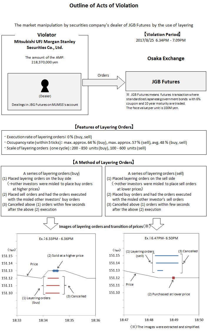 MUMSS is a stock company that is registered with the Commissioner of the Kanto Local Finance Bureau as a Type I Financial Instruments Business operator. MUMSS, through its employee who engaged in dealing, in relation to its business, regarding 10-year Japanese Government Bond Futures, September 2017 (“10-year JGB Futures”), which was listed on Osaka Exchange, Inc. (“Osaka Exchange”), from 6:34 PM to 7:09 PM on August 25, 2017 as described in the Appendix, with the purpose of inducing Market Transactions of Derivatives of other market participants, without intention to execute, placed buy orders for 6,253 units and sold 177 units by placing a large amount of buy orders at the best bid price and below, and placed sell orders for 1,844 units and bought 158 units by placing a large amount of sell orders at the best offer price and above, on the Osaka Exchange. These transactions constituted a series of Market Transactions of Derivatives and offers that would mislead other investors into believing that Market Transactions of Derivatives were thriving and would cause fluctuations in the market of 10-year JGB Futures.